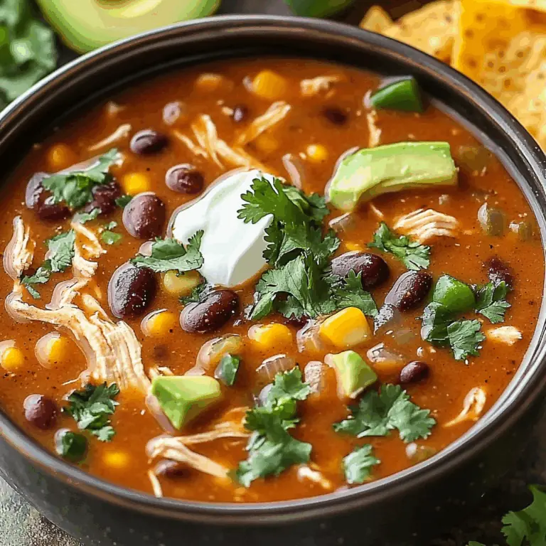 The ingredients are straightforward yet flavorful: tender chicken breasts, black beans, sweet corn, diced tomatoes, enchilada sauce, chicken broth, and a mix of chili powder, cumin, salt, and pepper. Olive oil, onion, and garlic form the aromatic base that sets the tone for the soup. Finally, the toppings—shredded cheese, sour cream, chopped cilantro, avocado slices, lime wedges, and crispy tortilla strips—add the finishing touch, turning a simple soup into a festive and satisfying meal.