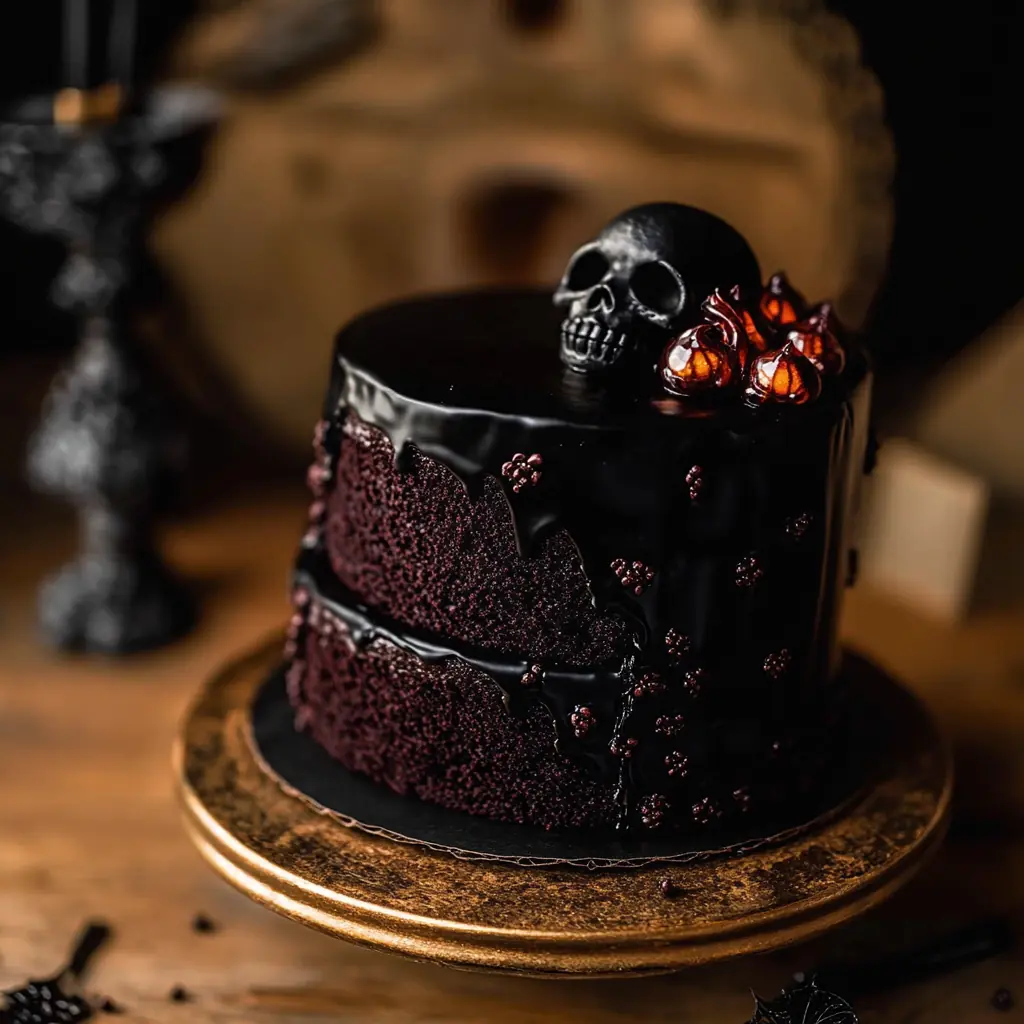 There are so many reasons to fall in love with this cake. First, the texture is incredibly soft and moist, making every bite melt in your mouth. The combination of black cocoa powder and fresh blackberries creates a rich, deep flavor that feels indulgent yet balanced. Beyond the taste, the visual appeal is stunning—the dark, almost mystical cake layers topped with chocolate skulls and fresh blackberries instantly impress guests. It’s a dessert that looks professional without requiring complicated techniques.